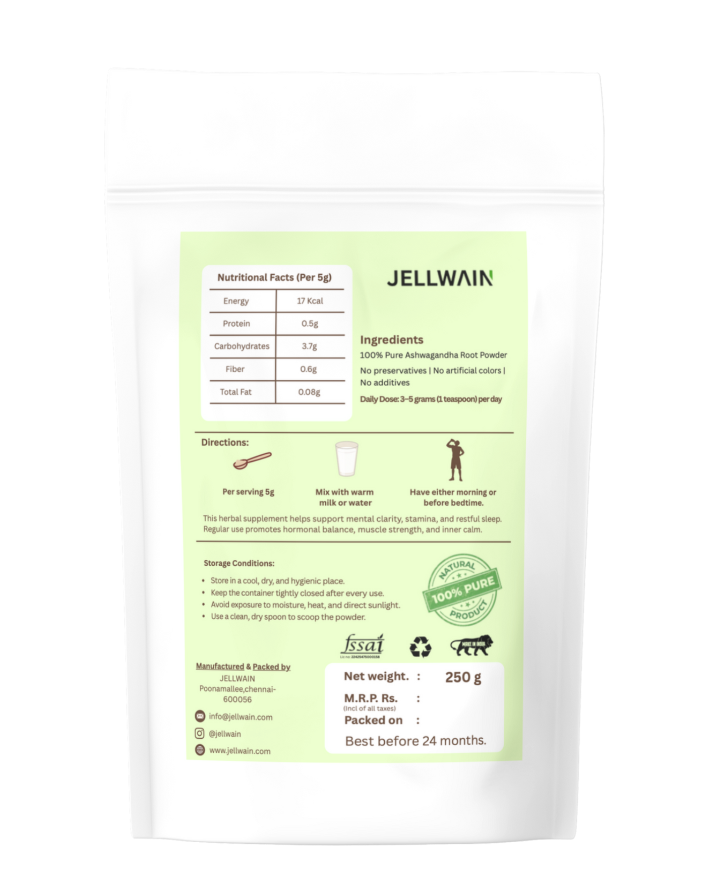 + Free ShippingFree from additives and preservatives, our Ashwagandha powder is ideal for daily use — simply mix it with warm milk, water, or smoothies for a calm mind and energized body.